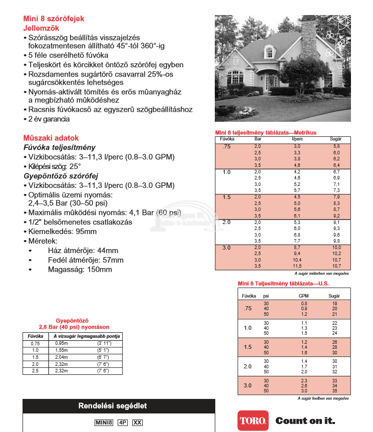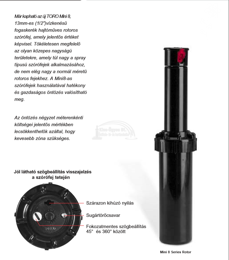 Toro Mini 8 rotoros szórófej + 5 fúvóka, R 40°-360°-ig, r=4,6-9,2m