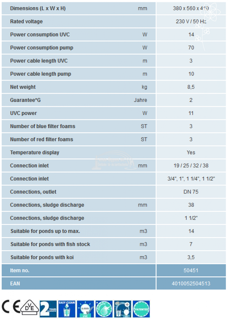 Oase BioSmart Set 14000, átfolyós tószűrő szett 11W UV-C készülékkel, 3.400L/h szűrőtápláló szivattyúval. Átfolyós vagy más néven gravitációs szűrő szett, Oase BioSmart 14000 kerti tó szűrő, Vitronic 11W UV-C készülékkel, FP 3500 - 3.400L/h teljesítményű szűrőtápláló szivattyúval, 3 fm 3/4"-os tömlővel és csatlakozókkal, vízhőmérővel, vízszint kijelzővel, oxigénnel dúsító speciális csatornával. Halasítás nélkül 14.000L-es, halasítva ~ 9.000L-es tavakig ajánlott, halmennyiség függvényében. UV-C blokk lebegő algák ellen, szűrő filterek a fizikai szennyeződések ellen és a biológiai szűréshez.