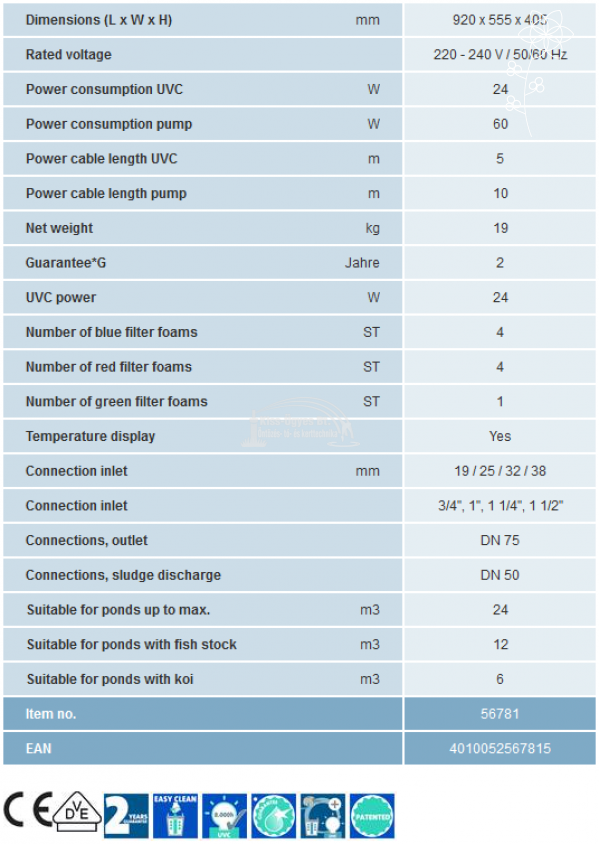 Oase BioSmart Set 24000, átfolyós tószűrő szett 24W UV-C készülékkel, 5.300L/h szűrőtápláló szivattyúval. Átfolyós vagy más néven gravitációs szűrő szett, BioSmart 36000 kerti tó szűrő, Vitronic 24W UV-C készülékkel, AquaMax Eco Classic 5500 - 5.300L/h teljesítményű szűrőtápláló szivattyúval, 5 fm 1 1/2"-os (6/4") tömlővel és csatlakozókkal, vízhőmérővel, vízszint kijelzővel, +  100 ml BioKick szűrőindító baktérium. Halasítás nélkül 24.000L-ig, halasítva 12-15.000L-ig függően a halak számától, koi-k esetében 6.000L-ig ajánlott. UV-C blokk lebegő algák ellen, szűrő filterek a fizikai szennyeződések ellen és a biológiai szűréshez.