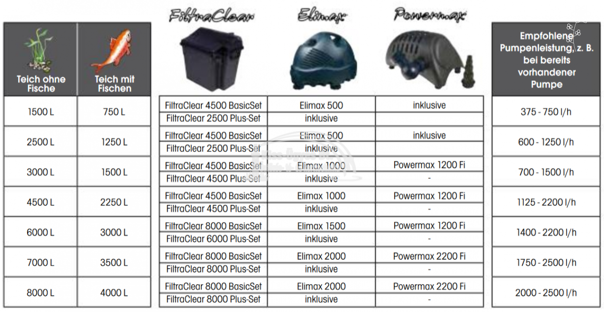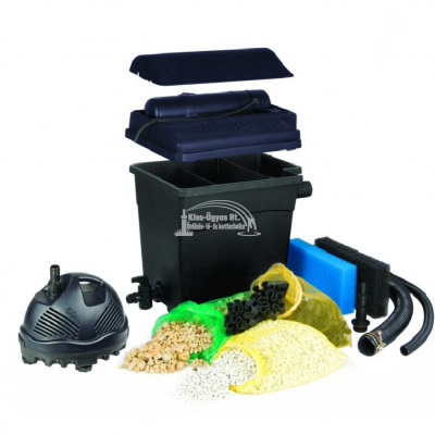 Ubbink FiltraClear 6000 Plus Set. Átfolyós tavi szűrő szett, 9 W UV-C szűrővel, Elimax 1500 szűrőtápláló szivattyúval. Átfolyós vagy más néven gravitációs szűrő 9W-os UV-C lámpával lebegő algák ellen, 1.500L/h szűrőtápláló szivattyúval, tömlővel és csatlakozókkal. Halasítás nélkül 6.000L-es, halasítva ~ 4.000L-es tavakig ajánlott, halmennyiség függvényében. Három kamrás szűrő: UV-C blokk lebegő algák ellen, szűrő filterek a fizikai szennyeződések ellen, lávakő a biológiai szűréshez.