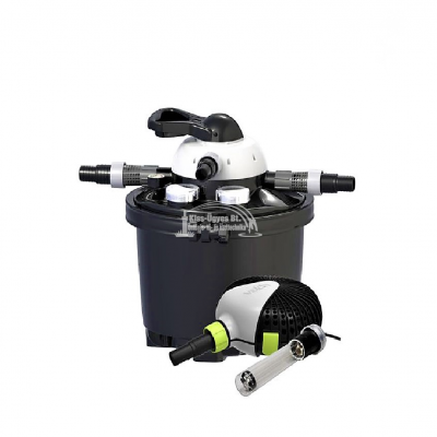 Velda Clear Control 25 Set, nyomásszűrő szett, 9W beépített UV-C készülék, Green Line 5000 -5.000L/h szivattyúval, ~ 5 fm tömlővel, csatlakozókkal. UV-C blokk lebegő algák ellen, szűrő filterek a fizikai szennyeződések ellen, aktív szén a kémiai anyagok ellen, lávakő a biológiai szűréshez. Üzemi nyomás 1.5 bar, a megtisztított vizet 1 m-es magasságig lehet felvezetni patak üzemeltetéséhez. Halasítás nélkül 10.000L-ig, halasítva 5-6.000L-ig a halmenyiség függvényében ajánlott. A szűrő tetején lévő, 7 fokozatba forgatható karral lehet beállítani a szűrő funkcióit, pl: 1. visszamosatás, 2. szűrés nélküli keringetés 3. kimosatás 4. szűrés 5. leállítás tisztításhoz (először a szivattyút kell leállítani) 6. gyógyszeres kezelés 7. téli leállás. 2 év garancia. Opcióként felszerelhető 300W-os fűtőkészülékkel.