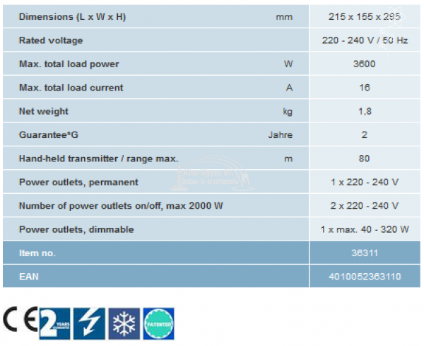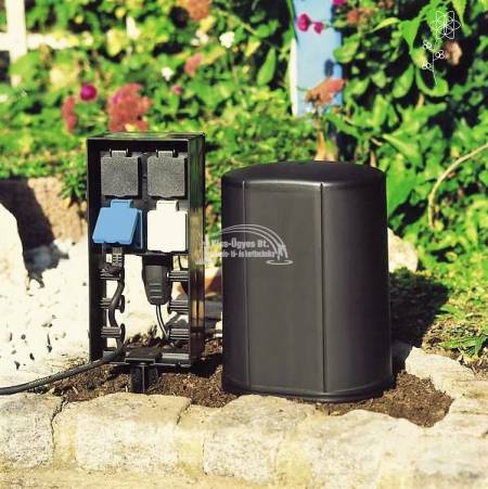 Oase InScenio FM-Master 3 elektromos kültéri aljzat távirányítóval, 3.600W maximális terhelhetőség, 16 A. 1db normál 230V-os kültéri aljzatot, 2db távirányítóval ki-be kapcsolható, együttesen max.2.000W-ig terhelhető és 1 db távirányítóval ki-be kapcsolható, 40 - 320W-ig szabályozva terhelhető kültéri aljzatot tartalmaz. A távirányító maximális hatótávolsága 80 m. A szett részét képezi még 1 db távirányító, 1 db leszúró tüske és 1 db műanyag ráhúzható műanyag fedél. Opcióként rendelhető hozzá mészkő hatású borító - takaró fedél. 2 év garancia.