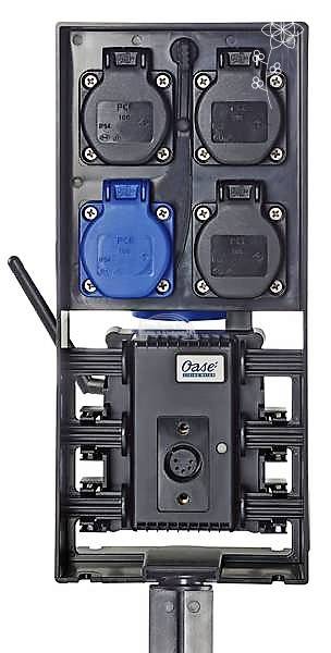 Oase InScenio FM-Master WLAN EGC elektromos kültéri aljzat, 3.600W maximális terhelhetőség, 16 A. Okostelefonról,  vagy tabletről (iOS vagy Android), WiFi-n keresztül vezérelhető. Egyszerűen töltse le az alkalmazást (az Apple Store vagy a Google Playen keresztül). Minden konnektorba 24 órás időzítő van beépítve. 3db távirányítóval ki-be kapcsolható, együttesen max.2.000W-ig terhelhető és 1 db távirányítóval ki-be kapcsolható, 40 - 320W-ig szabályozva terhelhető kültéri aljzatot tartalmaz. Akár 10 távirányítású OASE eszközt lehet integrálni és vezérelhető az alkalmazáson keresztül. A szivattyúk közül, melyek rendelkeznek teljesítményszabályozási lehetőséggel és-vagy WLAN-os csatlakozási lehetőséggel, a Jet jellegű szökőkutak, vízijátékok. A rádiófrekvencia és a WiFi maximális hatótávolsága 80 m. A szett részét képezi még 1 db távirányító, 1 db leszúró tüske és 1 db műanyag ráhúzható műanyag fedél. Opcióként rendelhető hozzá mészkő hatású borító - takaró fedél.