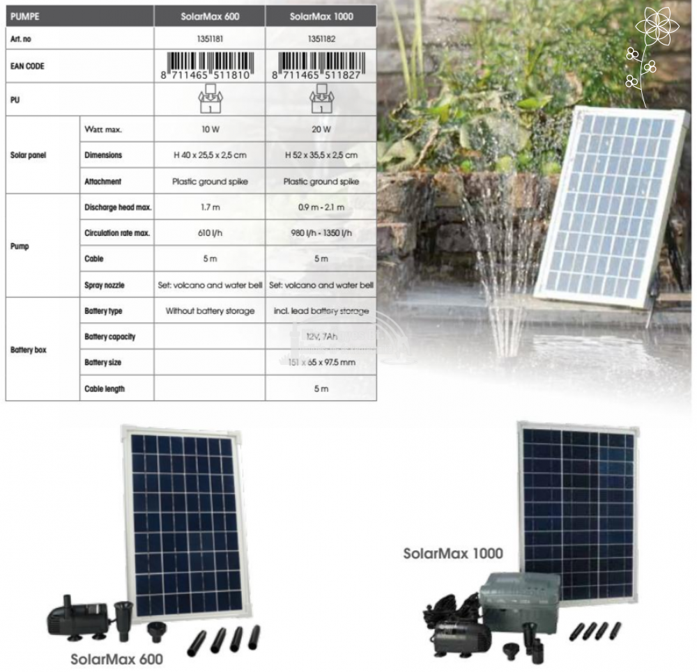 Ubbink SolarMax 600 napelemes szökőkút, 610L/h, 2 fúvókával (2 év garancia)