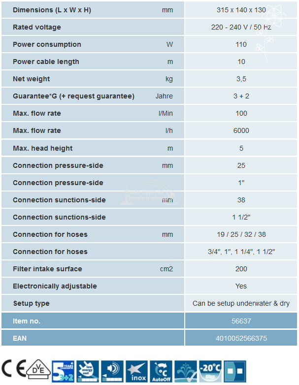 Oase Aquarius Universal Prémium 6000 patak, vízesés és szökőkút szivattyú elektronikus teljesítményszabályozási lehetőséggel, 6.000L/h. Főbb jellemzői: Elektronikusan és mechanikusan is állítható az áramlási sebesség. Rendkívül csendes működés magas nyomástartomány és alacsony energiafogyasztás mellett. Vízbe és aknába való telepítésre is alkalmas. Alacsony vízmélységbe is telepíthető.