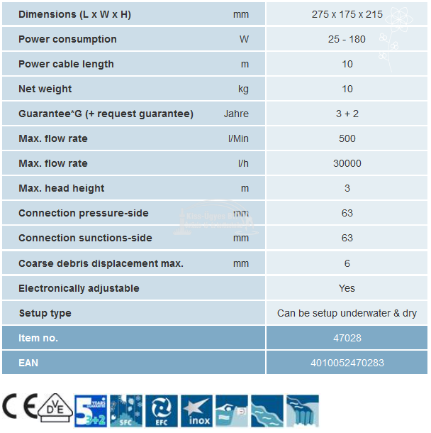 Oase AquaMax Eco Titanium 30000 szűrőtápláló szivattyú AquaMax Eco Control inteligens és SFC vezérléssel, 30.000L/h. Innovatív, energiahatékony gravitációs szűrő szivattyú nagy vízfelületekhez és kois tavakhoz. Az áramlás optimalizált hidraulika következtében akár 50%-os energiamegtakarítás. Robosztus öntött acél szivattyúház. A rozsdamentes acél hidraulika és járókerék által hosszú élettartam.  Az innovatív AquaMax Eco Control DMX-RDM kábeles vezérlés, szabályozás, tartozéka a szivattyúnak. Az SFC funkció bekapcsolásával további 30% energiamegtakarítás érhető el, a vízhőmérséklet függvényében. A szivattyú kimenet 90°-al elforgatható állított helyzetbe. Ideális telepítés szivattyú kamrába, de alkalmas víz alatti telepítéshez is. Kiváló minőségű SIC kerámia csapágyakkal ellátva.