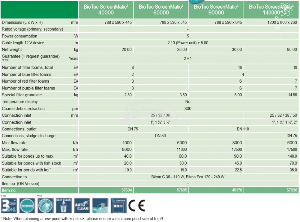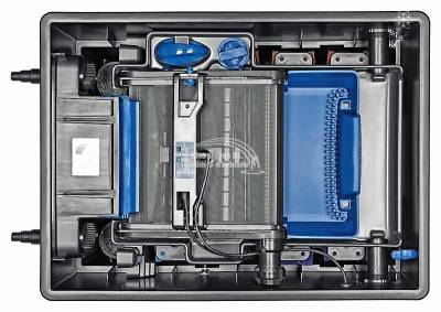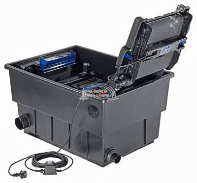 Oase BioTec ScreenMatic2 40000, átfolyós szűrő. Átfolyós vagy más néven gravitációs szűrő, csatlakozók, minimum átfolyásigény 4.000L/h, maximális átfolyás 9.000L/h. Optimálisan kombinálható a Bitron Eco 120 - 240 W, Bitron C 36 - 110 W UV-C algaleválasztó előszűrőkkel. A szűrő minden egysége prémium minőségű. A Screenmatic tecnológia rendkívül nagy mértékben növeli a szűrő kapacitását, illetve megnöveli a tisztítási időközöket. Ez azon alapul, hogy a durva szennyeződéseket a szűrő egy szita segítségével egy tálcára gyűjti, ez által növelve a szűrőszivacsok befogadó kapacitását. Halasítás nélkül 40.000L-ig, halasítva 20-25.000L-ig halmennyiség függvényében, koi-k esetén 10.000L-ig ajánlott. UV-C blokk lebegő algák ellen, szűrő filterek a fizikai szennyeződések ellen, lávakő a biológiai szűréshez.