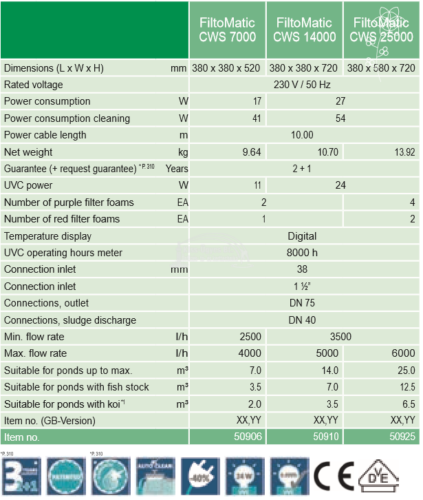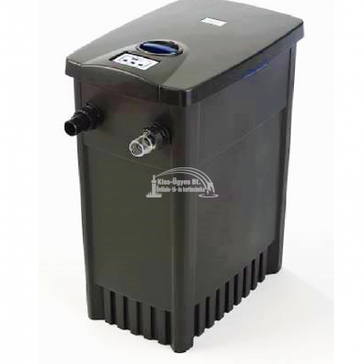 Oase FiltoMatic CWS 25000, átfolyós szűrő 24W UV-C készülékkel, kis zagyszivattyúval. Átfolyós vagy más néven gravitációs szűrő szett, inteligens LCD kijelzős vezérlőegységgel ellátott FiltoMatic CWS 25000 szűrő, 24W beépített UV-C készülék, mely szabadalmaztatott öntisztító technológiával rendelkezik, a vezérelt szennyvízürítéshez beépített kis zagyszivattyú, csatlakozók. Minimális átfolyás igény 3.500L/h, maximális átfolyás 6.000L/h. A vezérlőegységnek köszönhetően manuális vagy előre programozott tisztítási ill. teljesítmény szabályozási programokat lehet futtatni. A vezérlőegység leállítás, (pl. tél) esetén könnyedén kivehető a szűrőből. Kis helyigényű készülék, mely magasságának ~ 70%-áig lesüllyeszthető a talajba. Opcióként vásárolható hozzá kő utánzatú borító fedél. Halasítás nélkül 25.000L-ig, halasítva 13-15.000L-ig függően a halak mennyiségétől, koi-k esetén 7.000L-ig ajánlott. UV-C blokk lebegő algák ellen, szűrő filterek a fizikai szennyeződések ellen és a biológiai szűréshez.