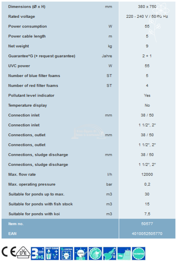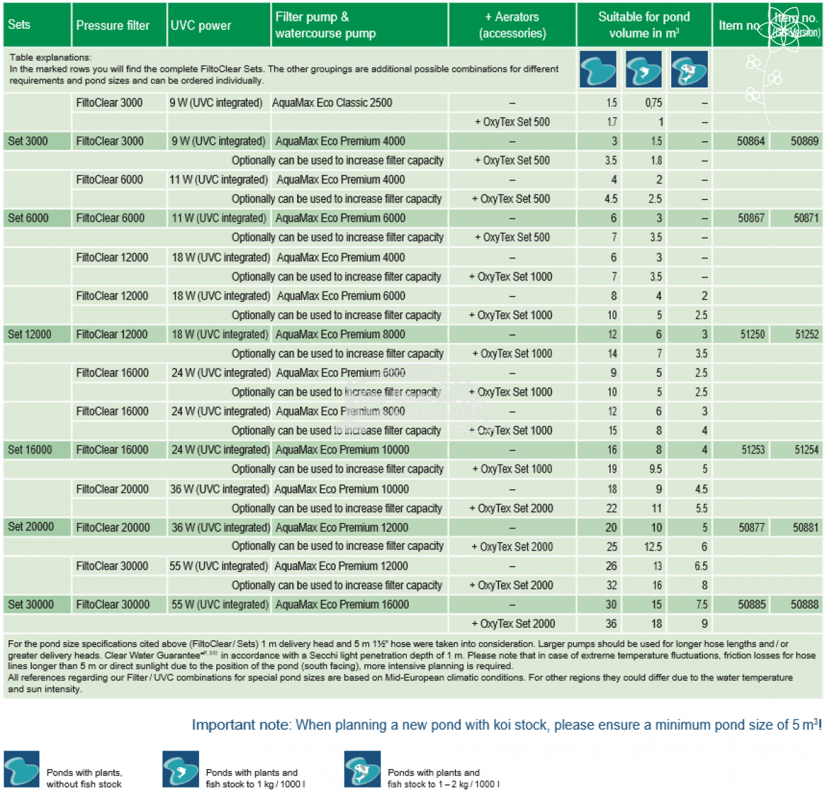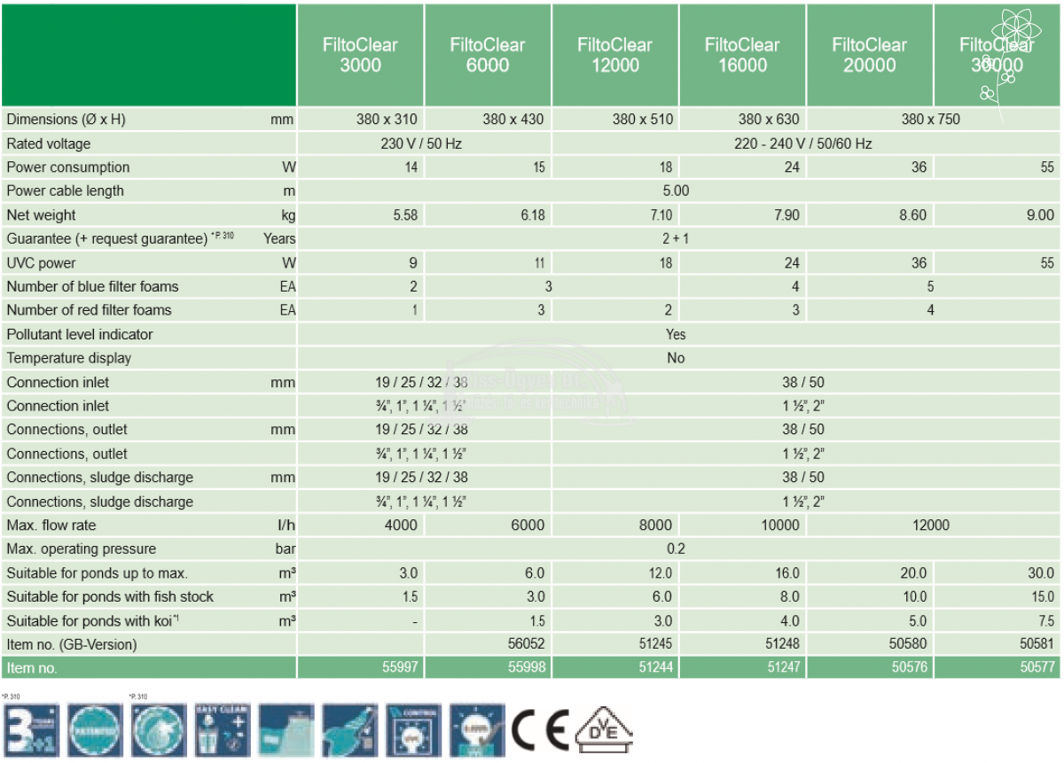 Oase FiltoClear 31000 nyomásszűrő, beépített 55W UV-C készülékkel, csatlakozókkal. Maximális áteresztő képesség 12.000L/h. A megtisztított vizet 1-1,5 m-es magasságig lehet felvezetni patak üzemeltetéséhez. Halasítás nélkül 30.000L-ig, halasítva 15-18.000L-ig a halmenyiség függvényében, koi-k esetén 7.000L-ig ajánlott. A szűrő tetején kivezetett kar segítségével szétszerelés nélkül könnyedén elvégezhető egy gyorstisztítás. A szennyezett víz kivezetésére külön kimenet szolgál, mely egy irányváltó csap segítségével könnyedén üzembe helyezhető. UV-C blokk lebegő algák ellen, szűrő filterek a fizikai szennyeződések ellen, a biológiai szűrést a nitrifikáló baktériumok megtelepedését segítő műanyag labdacsok fokozzák. A szűrőház ~ 2/3-ig talajba temethető. Opcióként külön megvásárolható hozzá egy kő hatású fedőburkolat.