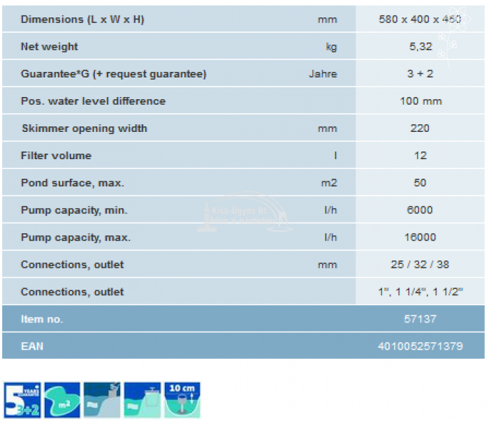 Oase BioSys Skimmer Plus, fix telepítésű vízfelület tisztító és levélszűrő, minimális szivattyúkapacitás 6.000L/h, maximális szivattyú kapacitás 16.000L/h, maximálisan 50 m2 vízfelszín tisztítására alkalmas. Szűrőkosár kapacitás 12L. A szűrőkosár vízszint ingadozás tűrésének mértéke 10 cm. Ajtónyílás szélessége 22 cm. A választott szivattyú a készlet részét képező hollanderes csúszócsatlakozóval könnyedén beépíthető. Megfelelő szivattyúk lehetnek az AquaMax Dry, vagy AquaMax Eco Premium típusok.