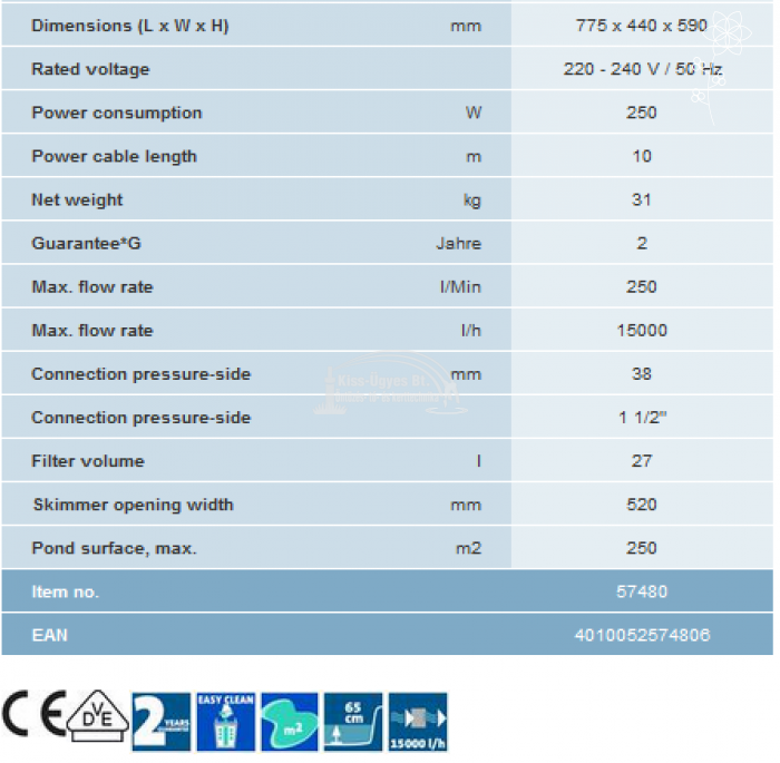 Oase Skimmer 250 vízfelület tisztító és levélszűrő, szivattyúkapacitás 15.000L/h, maximálisan 250 m2 vízfelszín tisztítására alkalmas. Szűrőkosár kapacitás 27L. Minimális vízmélység igénye 65 cm, a vízszint ingadozás tűrésének mértéke - jól igazodik a víz szintjéhez. Ajtónyílás szélessége a nagy teljesítményhez igazodva rendkívül nagy, 52 cm. A szivattyú a készlet részét képezi, AquaMax 15000, 15.000L/h teljesítménnyel, mely a széles szűrő beömlőnyílással együtt biztosítja az átlagon felüli szívóerőt és kapacitást. Rendkívül hosszú élettartam, köszönhetően a magas színvonalú kivitelezésnek és a rozsdamentes acél elemeknek. A csomag tartalmazza a rögzítéshez szükséges anyagokat.