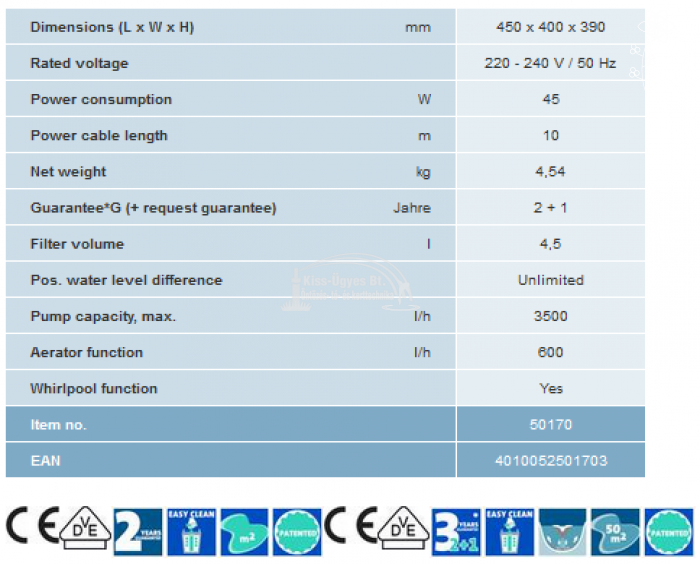 Oase SwimSkim 50 úszó vízfelület tisztító és levélszűrő, 3.500L/h motorral, maximálisan 50 m2 vízfelszín tisztítására alkalmas. Integrált légbefúvó gazdagítja a tó vizét oxigénnel, 600L/h. 40 cm felett bármely vízmélységnél alkalmazható. Szűrőkosár kapacitás 4,5L. 10 Fm kábel.