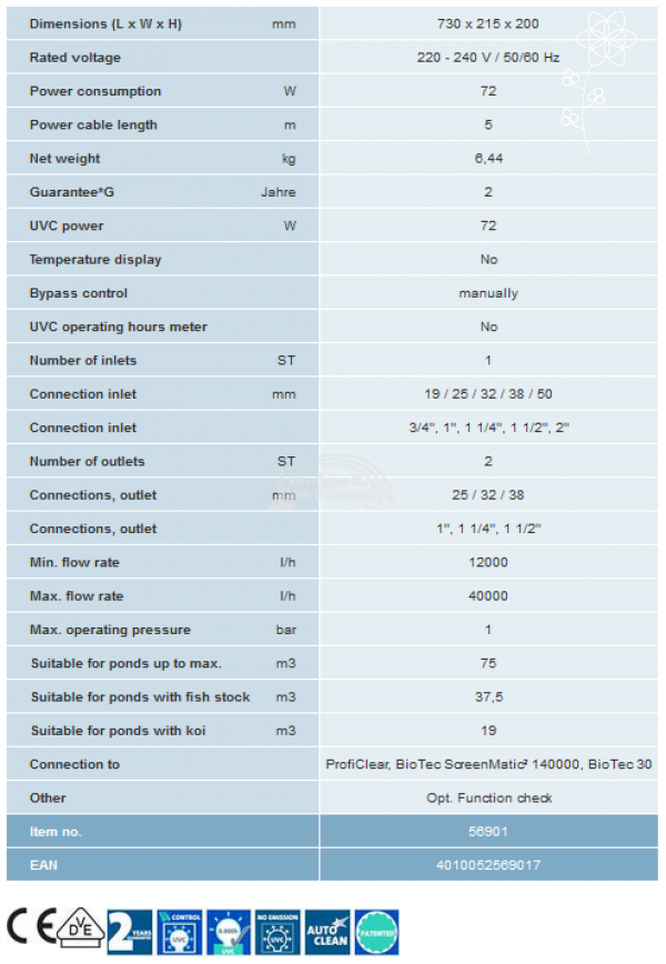 Oase Bitron 72 W, UV-C algaleválasztó előszűrő készülék lebegő algák ellen. Minimális áteresztő képessége 12.000L/h, maximális áteresztő képessége 40.000L/h. Halasítás nélkül 75 m3-ig, halasítva 38 m3-ig, koi-k esetén 19 m3-ig ajánlott. A készülék egy mikrokapcsolós gyorskioldó segítségével könnyen szétszedhető és összeilleszthető tisztítás alkalmával. Található rajta egy ellenőrző ablak, melyen keresztül biztonságosan ellenőrizhető az UV fénycső működése. Két kis kar segítségével lehet szabályozni az átfolyó víz útját. A fénycsövet védő kvarcüveg búrát egy szabadalmaztatott, vízáram segítségével forgatott tisztító egység védi a lerakódásoktól. A vízkőlerakódás ellen egy beépített mágnes is véd. A készülék a következő Oase termékekkel kompatibilis, oly módon, hogy előre elkészített  csatlakozásuk van kialakítva ezen típus számára: ProfiClear, BioTec ScreenMatic² 140000, BioTec 30.