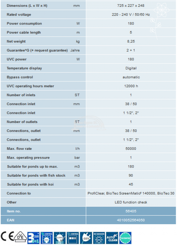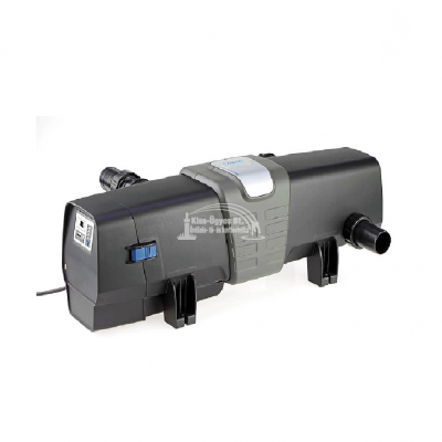 Oase Bitron Eco 180 W, UV-C algaleválasztó előszűrő készülék lebegő algák ellen. Maximális áteresztő képessége 50.000L/h. Halasítás nélkül 180 m3-ig, halasítva 90 m3-ig, koi-k esetén 45 m3-ig ajánlott. A készülék egy mikrokapcsolós gyorskioldó segítségével könnyen szétszedhető és összeilleszthető tisztítás alkalmával. Digitális vezérlőn keresztül ellenőrizhető az UV fénycső működése, állapota. Egy membrán segítségével lehet szabályozni az átfolyó víz útját, a szűrőrendszer adottságainak megfelelően. Új, egyedülálló, a Philips cég által kifejlesztett fénycsövekkel van felszerelve, melyek akár 50%-al csökkenthetik az energiafelhasználást, mely évi ~ 525 kg-al csökkenti a szén-dioxid kibocsátást és emellett élettartama jelentősen hosszabb, ~ 12.000 óra. A fénycsövet védő kvarcüveg búrát egy szabadalmaztatott, vízáram segítségével forgatott tisztító egység védi a lerakódásoktól. A vízkőlerakódás ellen egy beépített mágnes is véd. A megnövelt készülékház nagyobb vízmennyiség befogadására képes, növelve a hatékonyságot. A készülék a következő Oase termékekkel kompatibilis, oly módon, hogy előre elkészített  csatlakozásuk van kialakítva ezen típus számára: ProfiClear, BioTec ScreenMatic² 140000, BioTec 30.