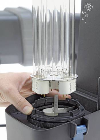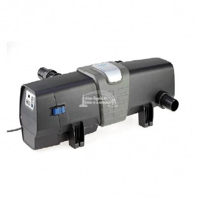 Oase Bitron Eco 240 W, UV-C algaleválasztó előszűrő készülék lebegő algák ellen. Maximális áteresztő képessége 50.000L/h. Halasítás nélkül 240 m3-ig, halasítva 120 m3-ig, koi-k esetén 60 m3-ig ajánlott. A készülék egy mikrokapcsolós gyorskioldó segítségével könnyen szétszedhető és összeilleszthető tisztítás alkalmával. Digitális vezérlőn keresztül ellenőrizhető az UV fénycső működése, állapota. Egy membrán segítségével lehet szabályozni az átfolyó víz útját, a szűrőrendszer adottságainak megfelelően. Új, egyedülálló, a Philips cég által kifejlesztett fénycsövekkel van felszerelve, melyek akár 50%-al csökkenthetik az energiafelhasználást, mely évi ~ 525 kg-al csökkenti a szén-dioxid kibocsátást és emellett élettartama jelentősen hosszabb, ~ 12.000 óra. A fénycsövet védő kvarcüveg búrát egy szabadalmaztatott, vízáram segítségével forgatott tisztító egység védi a lerakódásoktól. A vízkőlerakódás ellen egy beépített mágnes is véd. A megnövelt készülékház nagyobb vízmennyiség befogadására képes, növelve a hatékonyságot. A készülék a következő Oase termékekkel kompatibilis, oly módon, hogy előre elkészített  csatlakozásuk van kialakítva ezen típus számára: ProfiClear, BioTec ScreenMatic² 140000, BioTec 30.
