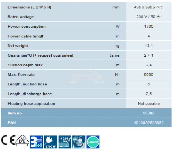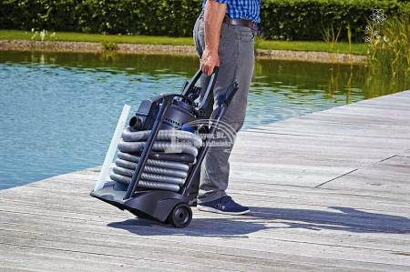 Oase PondoVac 4 iszapszívó, tóporszívó 3 az 1-ben, tóporszívó , medenceporszívó, vizesporszívó. 5000L/h kapacitású, 1.700W teljesítmény, hatékony szívási mélység max. 2,4 m, elektromos kábel hossza 4 m. Folyamatos felszívás az automatikus szennyezettvíz ürítés mellett, köszönhetően a szabadalmaztatott kétkamrás rendszernek - szimultán porszívózás és tartály ürítés. Optimalizált vágóél geometria. Kézi szívóerő szabályozás. Könnyen mozgatható, a 2 keréknek és az állítható fogantyúnak köszönhetően. Tavakhoz ( már úszótavakhoz is! ), medencékhez és vizes takarításhoz ajánlott, különböző fejekkel ellátva: padló-, görgős padló-, rés-, fonalalga- és változtatható, speciális iszapszívó, melynek nyílási tartománya 2-10mm között állítható. Tartozékok: 5 m szívó gégecső, 2,5 m nyomó gégecső, 4 részes merev szívószár, 3 alumínium + 1 átlátszó műanyag, 1 porzsák, 1 durva törmelék gyűjtő és a fentebb leírt tisztítófejek.
