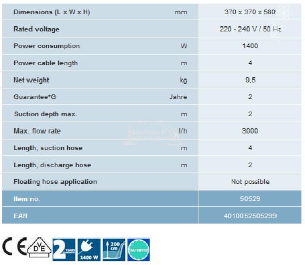 Oase PondoVac Classic iszapszívó, tóporszívó 3 az 1-ben, tóporszívó, medenceporszívó, vizesporszívó. 3000L/h kapacitású, 1.400W teljesítmény, hatékony szívási mélység max. 2 m, elektromos kábel hossza 4 m. Autómatikus szennyezettvíz ürítés. Kisebb tavakhoz, medencékhez és vizes takarításhoz ajánlott, különböző fejekkel ellátva: padló-, rés-, fonalalga- és változtatható, speciális iszapszívó, melynek nyílási tartománya 2-10mm között állítható. Tartozékok: 4 m szívó gégecső, 2 m nyomó gégecső, 4 részes merev szívószár, melyből egy átlátszó, 1 porzsák, 1 durva törmelék gyűjtő és a fentebb leírt tisztítófejek.
