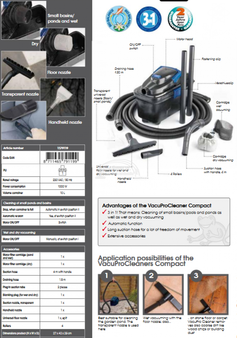 Ubbink Vacu ProCleaner Compact tóporszívó 3 az 1-ben, tóporszívó, vizes- és száraz porszívó. 10L kapacitású tároló, 1.000W teljesítmény. Autómatikus szennyezettvíz ürítés 12 másodpercenként. Kisebb tavakhoz, medencékhez ajánlott. Normál takarításhoz különböző fejekkel ellátva: szőnyeg, padló, bútor. Tartozékok: 4 görgős kerék, 4 m szívó gégecső, 1,5 m nyomó gégecső, 2 részes 1,5 m merev szívószár és a fentebb leírt tisztítófejek.