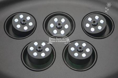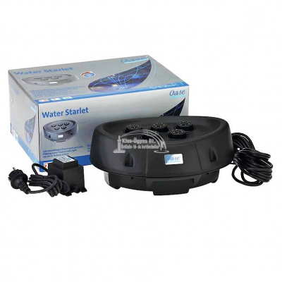 Oase Water Starlet úszó szökőkút színes LED-es világítással. Csatlakoztatásra kész komplett szett. A szett tartalma: 5 db vízsugaras fúvóka, darabonként 6 led világítással, 5 db szivattyú, transzformátor és kábel. A programok, fehér fény és a vízkép látvány elemei is körprogram szerint beállítható. A vízkép maximális magassága 0,7 m, képe tetszőlegesen beállítható a fúvókák döntésével. Szita rendszerű padlólap véd a szennyeződések általi eltömődéstől. Biztonságos, energiatakarékos 12 V technológia, úszótavakban is alkalmazható. Időzítőhöz is csatlakoztatható.