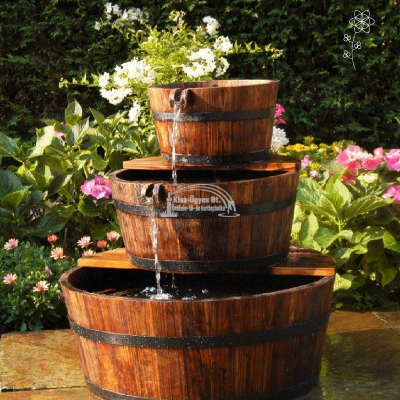 Ubbink Edinburg dekorációs szett, 3 fa dézsa, bennük 1-1 műanyag vízgyüjtő tartály, 600L/h szivattyú. Méretek: dézsák átmérői- 32/46/59 cm, teljes magasság: 72 cm.