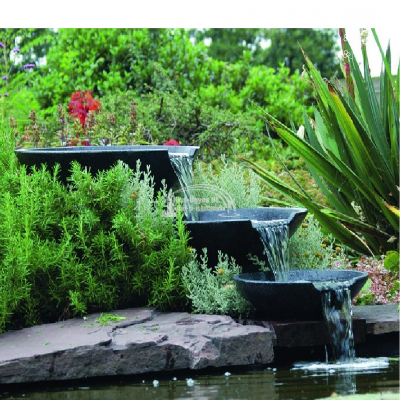 Ubbink Nova Scotia dekorációs szett, áll 3 db műgyantás kőporból készült kőhatású tálból, méreteik: D 35/45/55, egy 1.600L/h teljesítményű szivattyúból, 3 fm vízbekötő csőből, alátét tófóliából a tálak alá, hogy az esetlegesen mellé fröccsenő vizet vissza vezesse a tóba, vagy a vízgyűjtő edénybe, mérete: 0,5 mm vastag, 1,5 x 2 m. A szett ebben a formában csak tóból, medencéből, meglévő vízgyűjtő tartályból üzemeltethető, mivel a szett vízgyűjtő tartályt nem tartalmaz. A tartály és a rávaló rács külön megvásárolható.