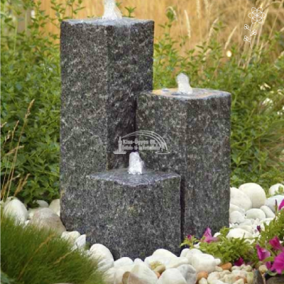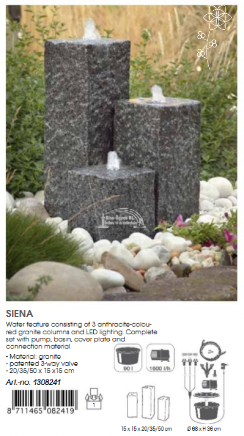 Ubbink Siena dekorációs szett, 68 x 36 cm-es, 90L-es fedeles műanyag tartály, 1.600L/h szivattyú, 3 db antracit színű, gránitból kialakított négyzet alapú oszlop, közepükön LED világítással, 3-as osztóval, vízbekötő csővel. Az oszlopok mérete: 15 x 15 x 20/35/50 cm. Felszín feletti telepítéshez vásárolható hozzá Ubbink Decowall Wicker I. antracit színű, vagy Decowall Wicker VII. világosszürke rattan borítás.