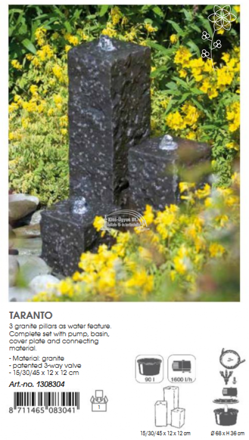 Ubbink Taranto dekorációs szett, 68 x 36 cm-es, 90L-es fedeles műanyag tartály, 1.600L/h szivattyú, 3 db antracit színű, gránitból kialakított négyzet alapú oszlop, közepükön LED világítással, 3-as osztóval, vízbekötő csővel. Az oszlopok mérete: 12 x 12 x 15/30/45 cm. Felszín feletti telepítéshez vásárolható hozzá Ubbink Decowall Wicker I. antracit színű rattan borítás.Felszín feletti telepítéshez vásárolható hozzá Ubbink Decowall Wicker I. antracit színű, vagy Decowall Wicker VII. világosszürke rattan borítás.