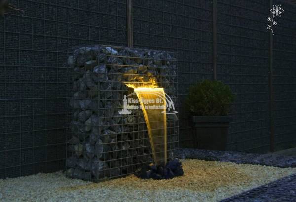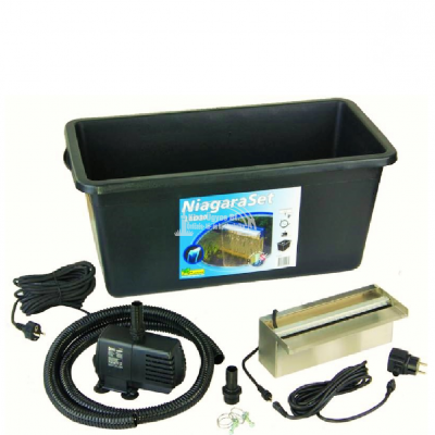 Ubbink Niagara 30 LED szett, 20 LED+ Xtra2300l/h pumpa+ Quadro I + kiegészítők. A burkoló-, fedő anyagokon kívül, minden elemet tartalmaz ami a vízesés látványelem kialakításához kell. Általa, egyedi vízesést készíthet, melynél a technikai paramétereken kívül csak a képzelete szabhat határt. A Quadro I tartály mérete: H 78 cm, Sz 39 cm, M 30 cm, térfogata 65L. A vízeséselem felső kidobó pereme maximum 75 cm-re lehet a vízgyűjtő ládában lévő víz felszínétől. A LED fénysor által este is kiemelkedő látványt biztosít a vízesésnek a kertben, vagy teraszon. 1" -os belsőmenetes bekötési lehetőség a tartály alján és hátulján. A méretezést a lentebbi ábrán találja. Ezen felül néhány ötlet képekben az alkalmazáshoz.